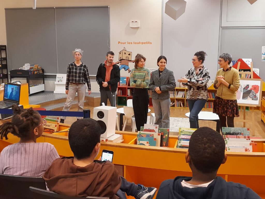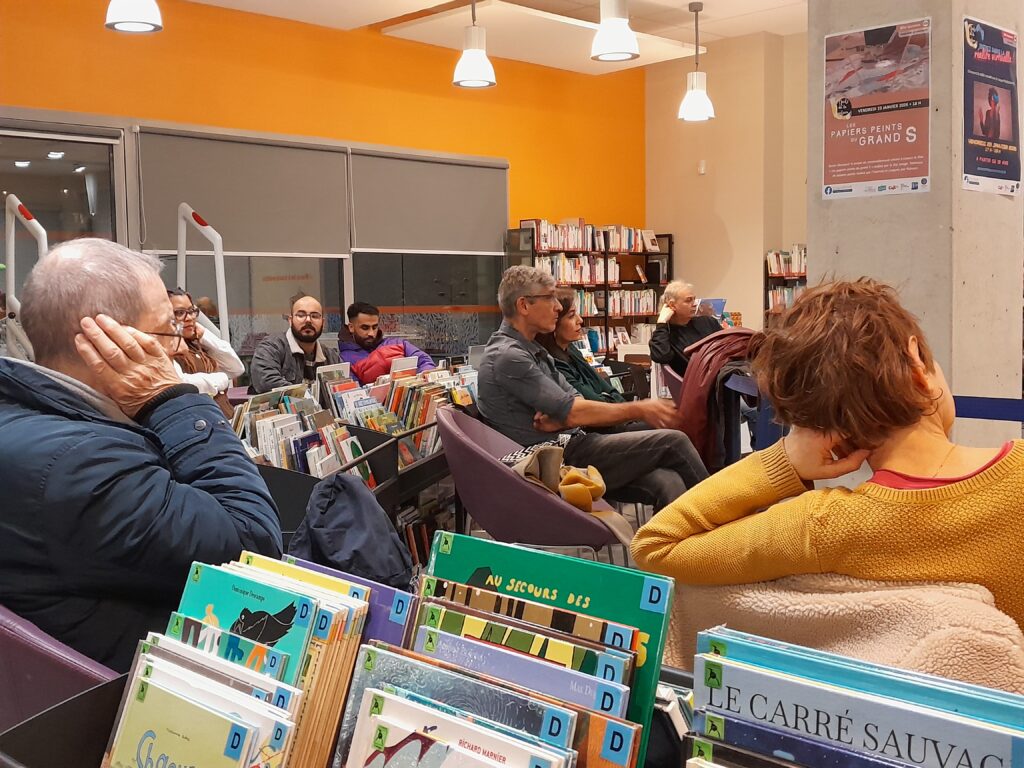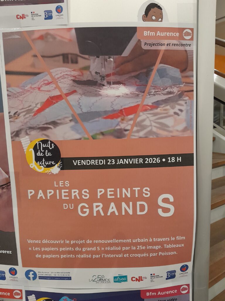 Une belle animation s’est déroulée Vendredi 23 Janvier à la BFM de l’Aurence dans le cadre de la nuit de la lecture. Pour la première fois ont été exposés les tableaux « Coutures et collages de papiers peints » réalisés par des habitants.es du quartier. Un atelier animé par Natacha Navarro qui était travailleuse sociale au sein du service Interval de l’ALSEA, et imaginé à partir d’un stock de papiers peints décollés dans les appartements de l’immeuble appelé « le Grand S » pendant le tournage du film documentaire de Sylvie Texier.